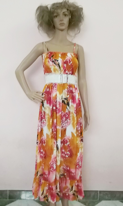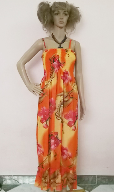 Đầm dài HongKong 2 dây hoa văn lạp thể cam chất liệu voan tropic